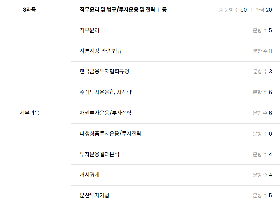 3과목은 직무윤리 및 법규/투자운용 및 전략Ⅰ 등이며, 총 문항수는 50, 과락기준은 20문항입니다.