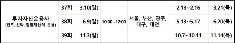 2024년 투자자산운용사 시험은 37회 차, 38회 차, 39회 차로써 총 3회 치러집니다. 2024년의 첫 시험은 3월 10일 일요일에 치러지게 되며, 마지막시험은 2024년 11월 3일에 치러집니다. 시험일에 따른 응시원서 접수기간을 꼭 메모해 두시고, 원서 접수기간을 놓치는 실수하지 않도록 주의해 주세요.