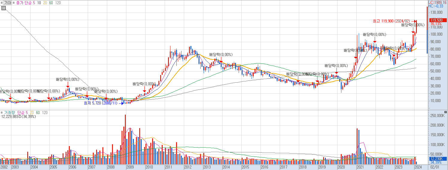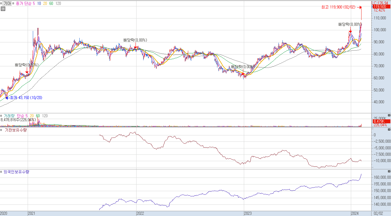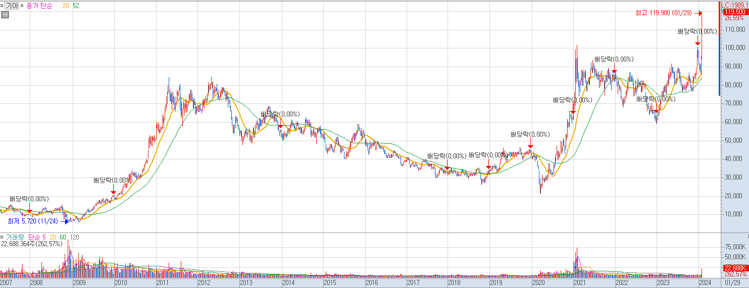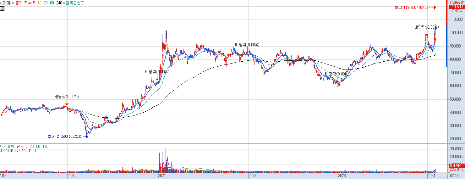 차트를 통해 기아 주가 전망을 해보겠습니다. 20년 폭락장에 21,500원을 기록 한 후 대상승장에 애플카 이슈에 힘입어 10만 2천원까지 상승을 했던 모습입니다. 이후 애플카 생산이 불확실해지면서 하락했지만 러시아의 공장 문제에도 큰 하락없이 6만원 선을 끝까지 지켜줬습니다. 기아차의 호실적과 전기차 시장에서의 사업확장에 대한 기대감이 계속해서 있었던 것 같습니다. 기아는 계속해서 좋은 실적으로 주가 방어를 해왔고 이번 저PBR 밸류업 지침이 촉매로 작용하면서 큰 상승을 보여줬습니다. 큰 거래량을 동반하며 역대 최고가를 경신한 것은 기아 주가 전망에 좋은 의견이 몰릴 수도 있다는 것을 기대해볼만 합니다. 기아 주가가 상승함에 따라 각종 전문가와 시장 참여자들의 관심이 더 몰리며 기아 주가 전망에 대한 레포트나 호의적인 의견이 나올듯 합니다.